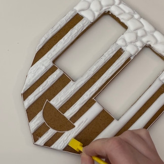 I took all the dough I had left and baked a large slab to act as a base for the house. Using very thick icing, I built the house, with the help of a can of green beans. I also piped icing along each seam, and spread it smooth with a paint brush.