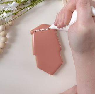 Using the light brown outline icing, make a line along the upper part of the cookie (where the top of the hanging would be - see photo). To help visualize where the "yarn" will be, you can add white dots with outline consistency along the underside of the brown line. I made 14 dots, but just make sure you have an even number. Add "V" shapes with the white outline icing over the brown line. These are the knots where the macrame hanging connects to the pole. Make sure the bottom of the "V" touches the dots you made previously. Then create little loops under each V shape. These don't have to be perfect or even exactly like mine. You just want to give the feel that it is made of yarn and knots.